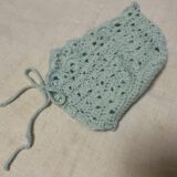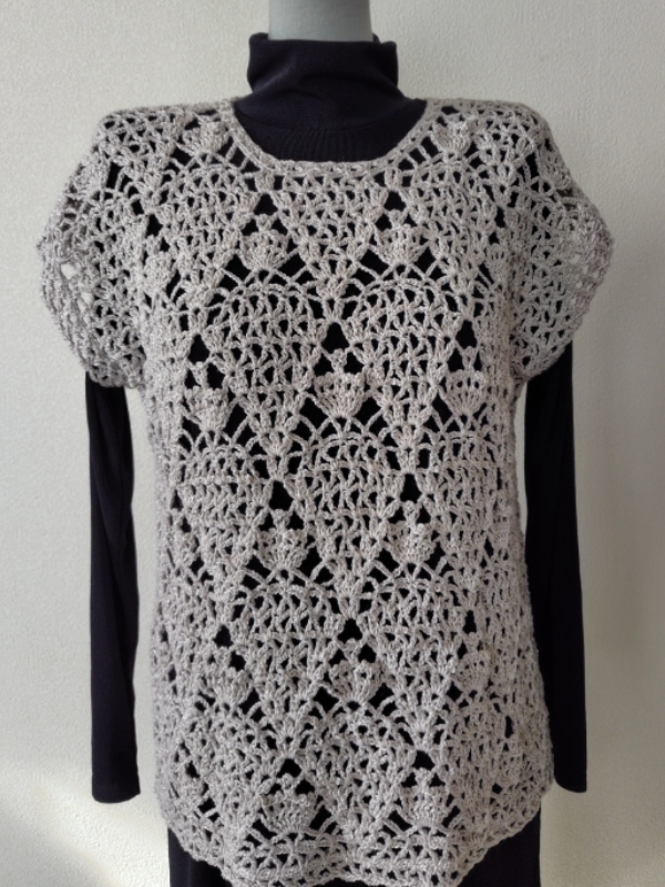 かぎ針編みのクラウンベストです。ダイヤのオーブを使用しています。冬系になるのですが、サラッとした手触りで少しのラメが混ざっていて、暑過ぎず寒過ぎない糸になります。春・秋に重宝するベストかと思います。
