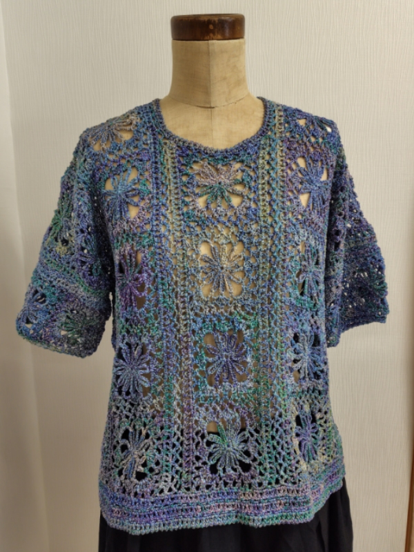 かぎ針編みモチーフプルオーバーです。スキーのセレーネを使用。モチーフを多くしたり少なくしたりで、好みの袖の長さにできます。