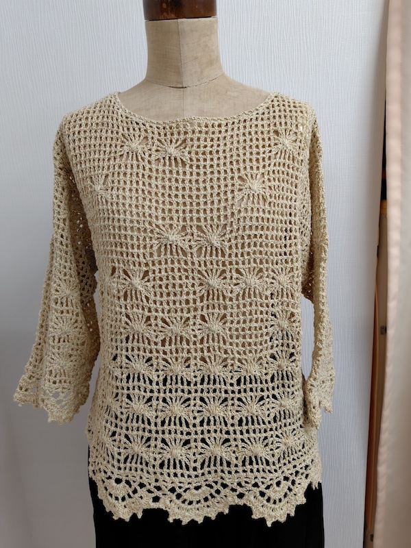 小花柄のかぎ針編みプルオーバーです。裾のモチーフを編んで輪にしてから、目を拾い前身頃・後身頃を編んでいきます。着丈・袖丈の変更が可能で、これからの季節にぴったりな1枚になっています。
