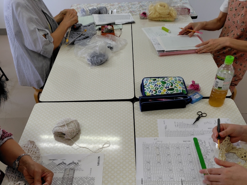 試験終了後、始めての授業日には、「今、私はどこを編んでいるのでしょうか?」と編み図と編みかけの作品を持って来られました。それだけ、試験勉強に集中していたので、これからはどんどん好きな作品を編んで頂きたいと思います。