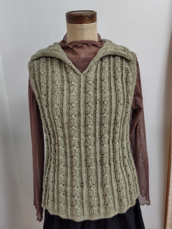 棒針編みの衿付きベストです。ダイヤのニコルを使用。身頃と一緒に衿や袖ぐりの縁編みをしているので仕上げが簡単です。