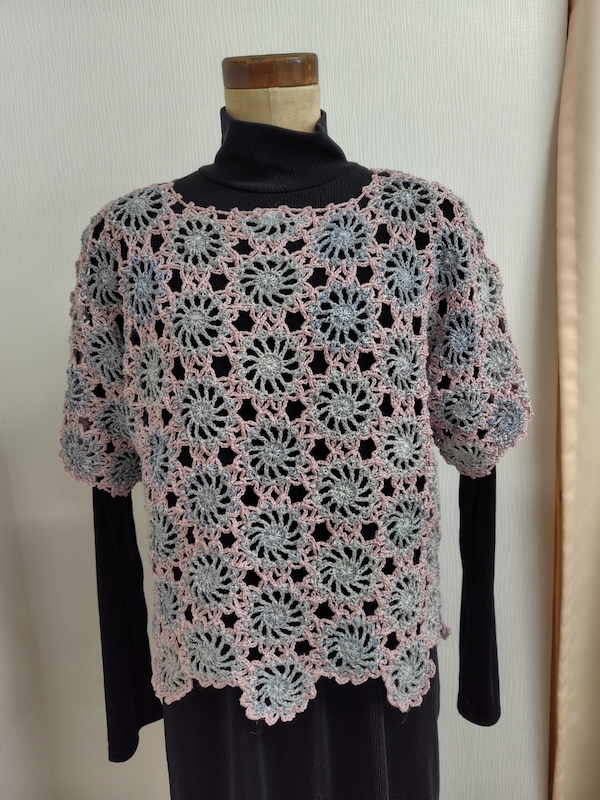 連続モチーフのプルオーバーです。ダイヤオランジュとダイヤコスタファインを使用した、連続モチーフの作品です。色の組み合わせや、そで丈・着丈を好みの長さにできるので同じ作品でも雰囲気が違うものに仕上がります。