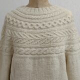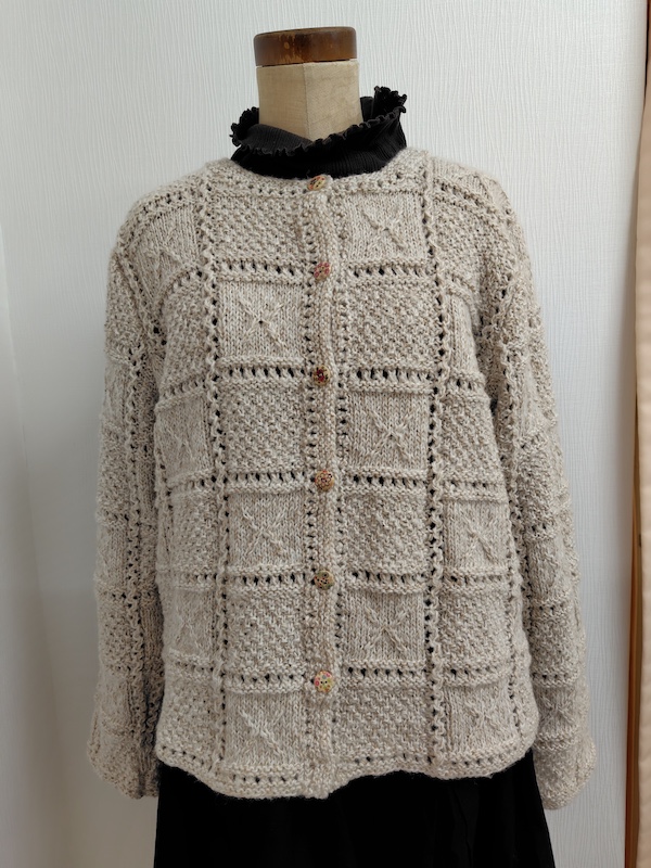 スクウェア模様のカーディガンです。スキー糸のミックスを使用したモチーフ模様に見える棒針編みのカーディガンです。軽くてとても暖かい作品になります。